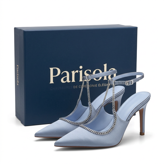 Escarpins Femme en Satin Bleu - Bride Chaîne - Talon Aiguille - Bout Pointu