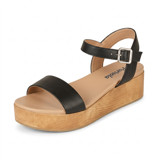 Sandales Femme à Plateforme Noire Effet Bois - Semelle Compensée - Bride Réglable