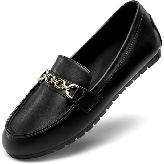 Mocassins Femme en Cuir Noir avec Détail Doré - Bout Rond - Semelle Plate Sans Lacets