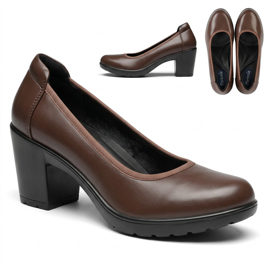 Escarpins Femme Marron à Talon Bloc - Bout Rond - Fermeture Classique - Semelle Antidérapante