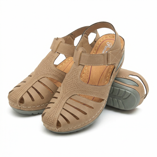 Sandales Fermées Compensées Femme Beige Découpes Bride Velcro