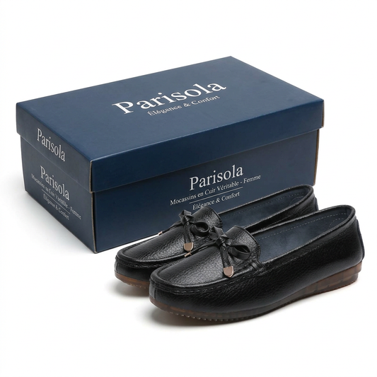 Mocassins Femme en Cuir Noir avec Nœud Décoratif - Bout Rond - Semelle Plate
